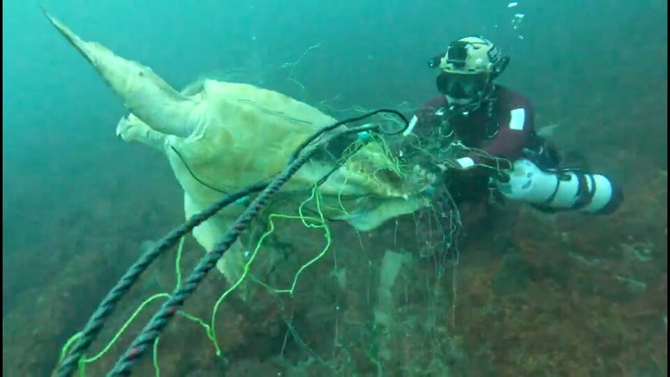 구조대는 칼로 그물을 조심히 잘랐다. 몇 번에 걸쳐 절단하다가 완전히 제거된 순간, 거북이는 깊은 바닷속으로 빠르게 헤엄쳐 사라졌다. 사라진 거북이 옆으로 길게 늘어선 그물이 보였다.