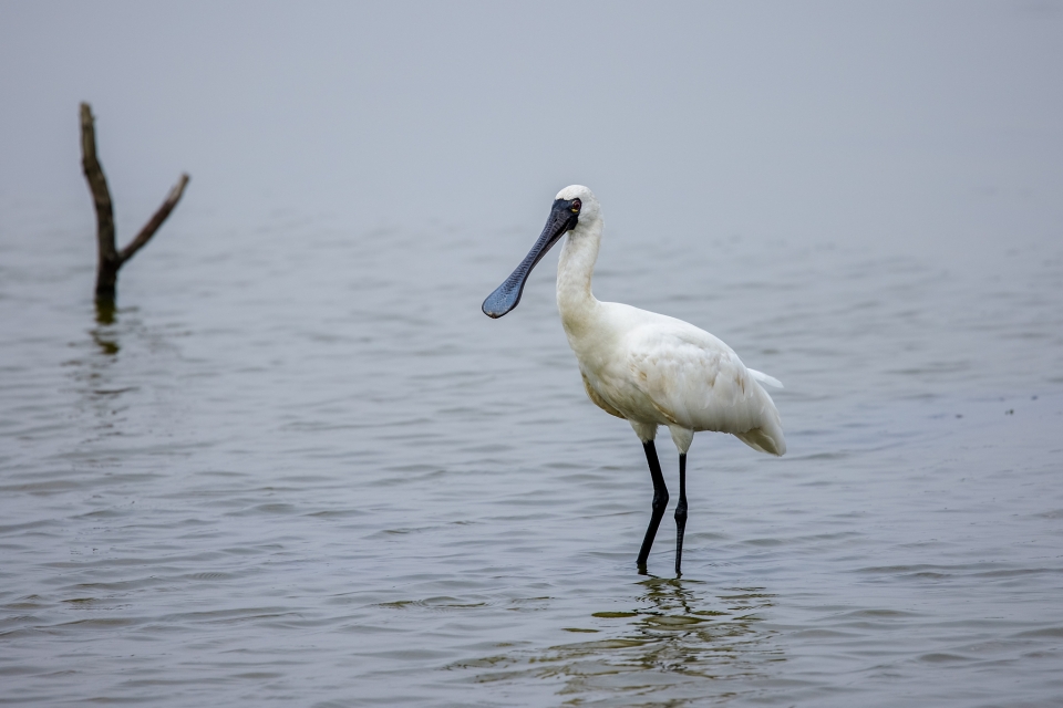 주걱같이 생긴 검은 부리와 새하얀 털에 긴 다리를 가진 저어새.