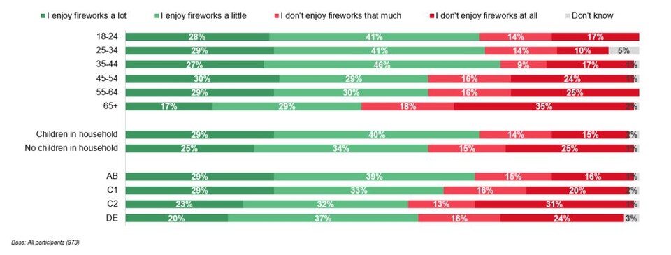 2021년 영국 제품안전표준국에서 실시한 '불꽃놀이에 대한 소비자 인식' 조사에 따르면, 응답자 약 61%가 불꽃놀이를 긍정적인 시선으로 보고 있으며, 불꽃놀이가 문화적으로 중요하기 때문에 금지해서는 안된다고 답한 이가 약 44%에 달했다.