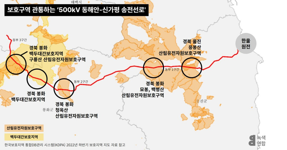 녹색연합은 한국전력의 '500kV 동해안-신가평 송전선로 건설사업'이 경북 울진의 백두대간보호지역 1곳과 산림유전자원보호구역 4곳을 관통한다고 1일 밝혔다.