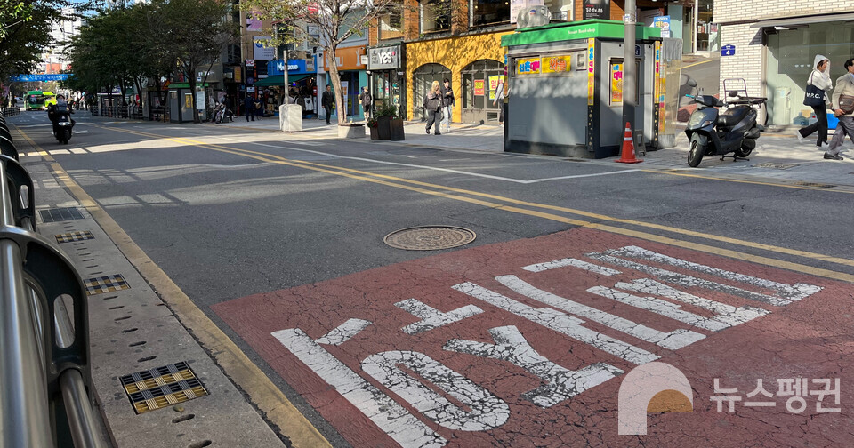 [뉴스펭귄 이수연 기자] 이달 1일부터 일반 차량의 통행을 다시 제한한 연세로에 지난 6일 찾아갔다. 버스가 지나가거나 보행자가 횡단보도를 건너지 않을 때는 주로 도로가 '텅' 비어 있었다. 간혹 일반 차량이 통행하기도 했지만, 전반적으로 다른 도로와 달리 통행하는 차량 자체가 적었다.