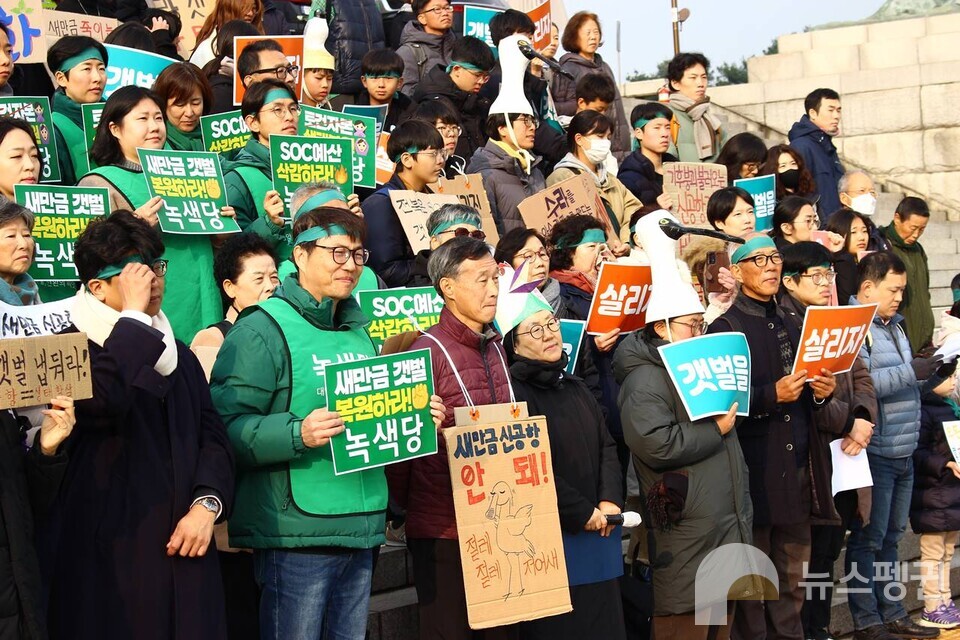 이에 11월 27일 오후 2시 국회 본관 앞 계단에서 '새만금 SOC 예산 삭감, 갯벌 복원 예산으로 전환' 궐기대회가 새만금신공항백지화공동행동(이하 공동행동), 국회의원 강은미·류호정·이은주·장혜영 의원실 공동 주최로 진행됐다.