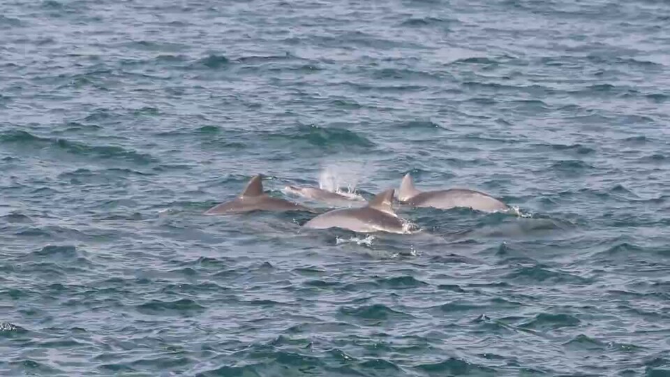 영상에는 제돌이가 다른 남방큰돌고래와 함께 유영하는 모습이 담겼다. 제돌이는 등지느러미의 1번 표식으로 구분할 수 있다.