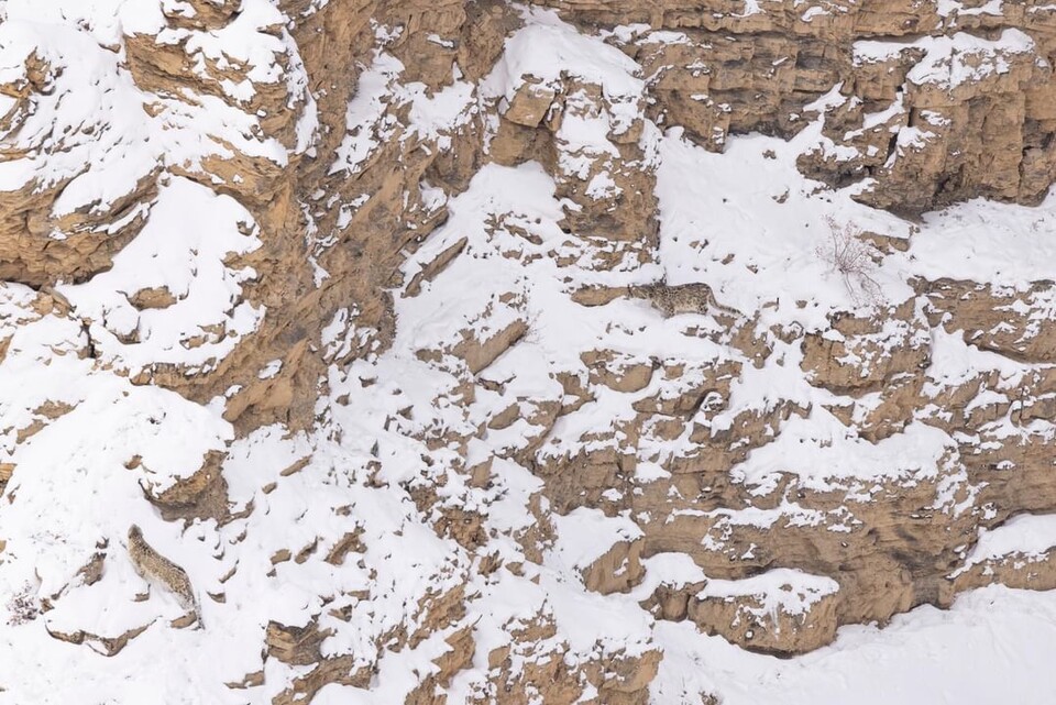 이 두마리는 남매다. 눈표범은 보통 단독생활을 해 두 개체가 함께 있는 모습을 포착하기 어렵다. 벤눈은 "매우 운이 좋았다. 눈표범은 마주치기 어렵고 야생에 많이 남아있지 않다"고 말했다.