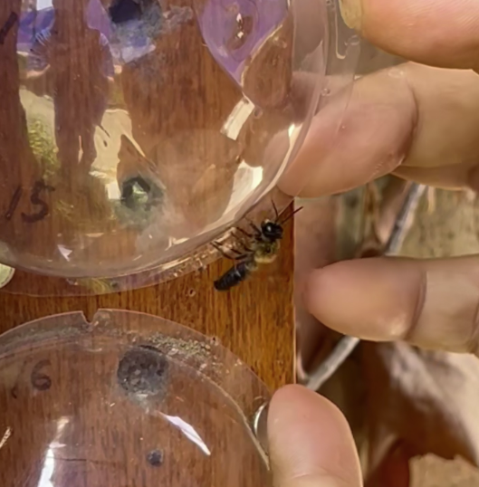 매일 테니스장을 찾는 신동훈 교수는 어떤 벌이 산란방에서 나오는지 확인하려고 구멍마다 투명 돔을 씌웠다. 밖으로 나온 벌들은 관찰 직후 야생으로 보내진다.