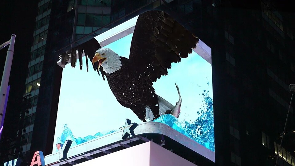 흰머리수리의 움직임은 3D 영상으로 구현됐다. 흰머리수리가 뉴욕 상공을 날다 타임스스퀘어 건물에 착륙하는 듯한 느낌이다.