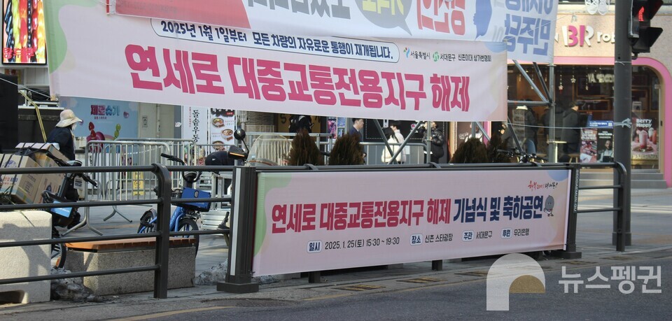 [뉴스펭귄 이수연 기자] 연세로에 지난달 1일부터 다시 차가 다니기 시작했다. 서울시가 신촌로터리에서 연세대 교차로까지 500m 구간의 차량 통행을 전면 허용하면서, 2014년 도입된 서울시 최초의 대중교통전용지구는 11년 만에 막을 내렸다.