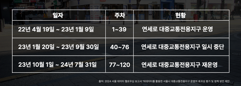 구한민 연구원은 2022년 4월부터 2024년 7월까지 연세로의 생활인구 변화를 분석하기 위해 KT와 서울시가 함께 생산하는 서울 생활인구 빅데이터를 활용했다. 이는 서울시가 분석한 기간보다 더 긴데, 대중교통전용지구를 운영하고 일시 해제했던 기간만이 아니라 재운영한 기간까지 포함했다.