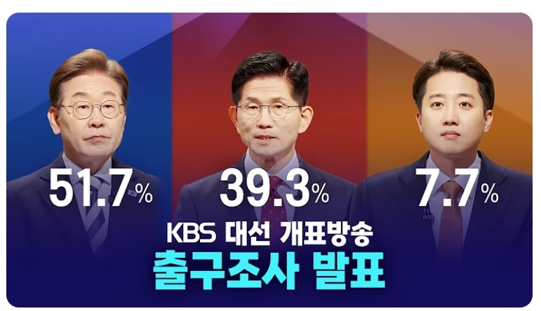 KBS, MBC, SBS 등 방송 3사는 이날 저녁 8시 출구조사 결과를 보도했다. 3사는 이재명 후보 51.7%, 김문수 후보 39.3%, 이준석 후보 7.7%, 권영국 후보 1.3%를 득표할 것으로 예측했다.