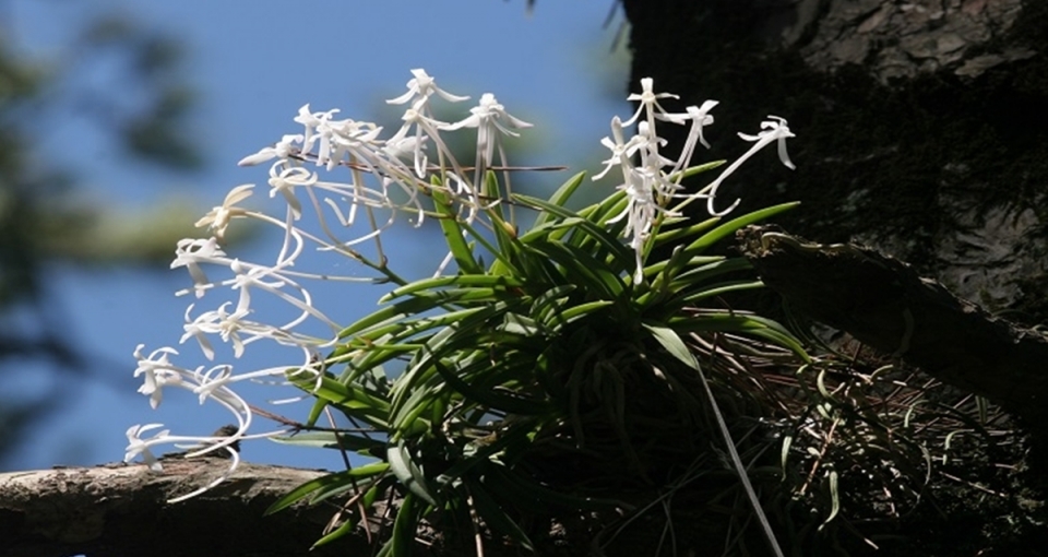 △생김새 및 생태특징: 멸종위기 야생생물 Ⅰ급 식물이다. 상록성 여러해살이풀로 바위나 나무에 착생하여 산다. 환경 적응력이 뛰어나고 재배가 비교적 쉬워 예부터 원예식물로 재배했다. 키 10㎝, 잎 5~10㎝, 폭 0.6~0.8㎝이다. 잎은 가늘고 긴 창모양이며 활처럼 잎 끝부분이 휘어진다. 짧은 마디에 2줄로 어긋나게 달려 브이(V)자 형태를 이룬다. 7~8월이면 3~5개의 흰색 꽃이 달린다. 꽃 향이 진하다. 꽃자루는 밑부분 잎집 사이에서 나온다. 2개의 꽃잎과 3개의 꽃받침이 있으며 꽃잎과 꽃받침이 비슷하게 생겼다. 꽃잎이 긴 꼬리처럼 생겨서 ‘꼬리난초’라고도 부른다. 10월이면 열매가 익는다. 안에 먼지와 같은 작은 종자들이 많이 들어있는 삭과다.