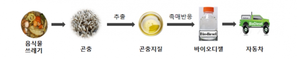 한국석유관리원은 음식물 쓰레기의 다양한 화학 성분이 곤충의 지방 세포에서 지질로 변환될 수 있다는 점에 주목했다. 지질은 에스테르 교환이라고 하는 화학 반응을 통해 디젤 생산을 위한 공급 원료로 쓰인다.