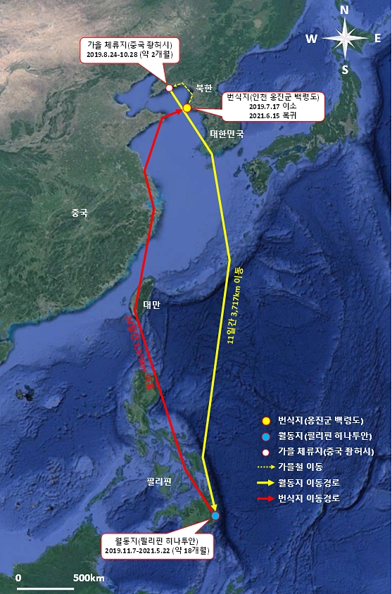 지난달 9일 서해를 건너 평안남도 온천군에 도착한 후 15일 번식지인 백령도로 되돌아왔다. 월동지에서 번식지까지 이동 기간은 24일. 총 3573km를 날아왔다.